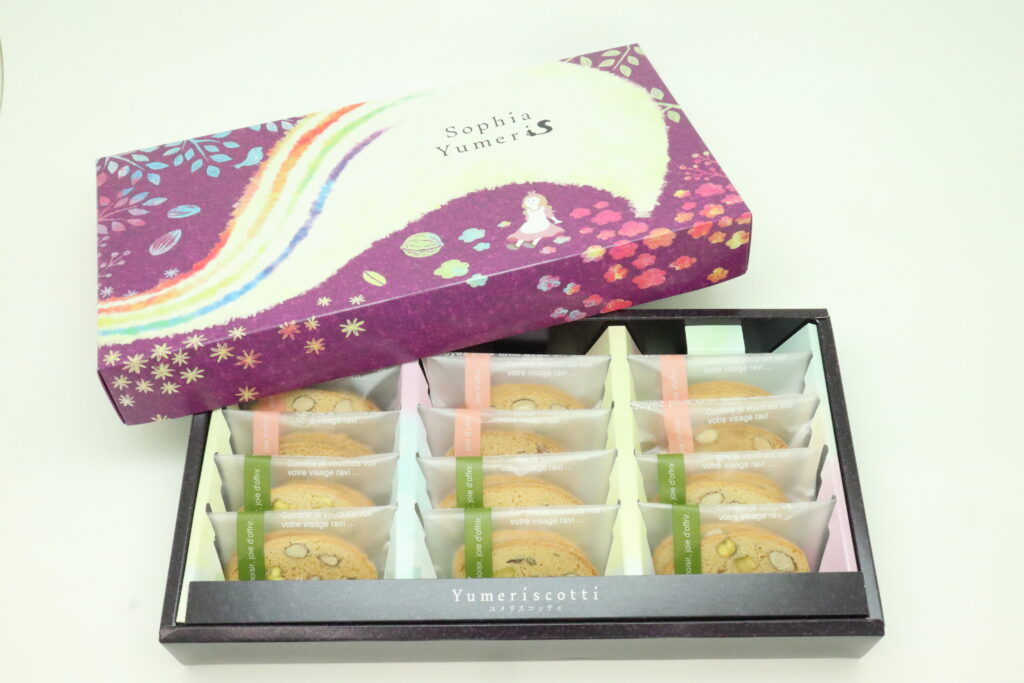 イタリアの伝統菓子【ビスコッティ】を参考に、ナッツを生地がまとまる限界量まで練りこみ、独自製法で可能な限り薄くスライスし、合計3度もの焼き工程で、軽い触感とナッツの風味を生かし、食べやすく仕上げた当店の看板商品です