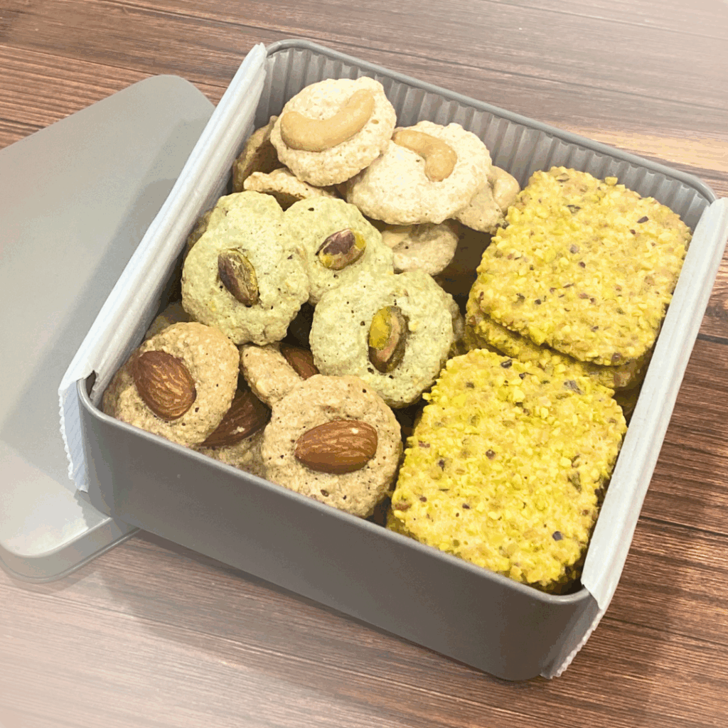 6種類のナッツを贅沢に使用し、それぞれのナッツの風味を楽しんでいただく為のクッキー缶を作りました